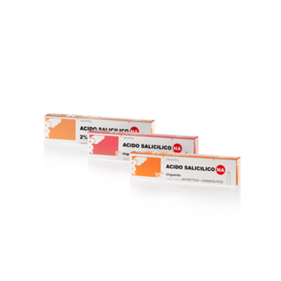 ACIDO SALICILICO NA 2% unguento. 100 g di unguento contengono: Principio attivo: acido salicilico 2 g. ACIDO SALICILICO NA 5% unguento. 100 g di unguento contengono: Principio attivo: acido salicilico 5 g. ACIDO SALICILICO NA 10% unguento. 100 g di unguento contengono: Principio attivo: acido salicilico 10 g. Per l’elenco completo degli eccipienti, vedere paragrafo 6.1.
