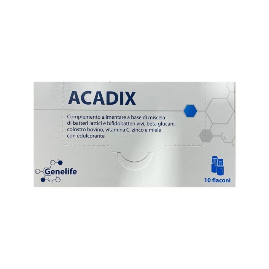 Acadix è un integratore alimentare a base di miscela di batteri lattici e bifidobatteri vivi, betaglucani, colostro bovino, vitamina C, zinco e miele, con edulcoranti.