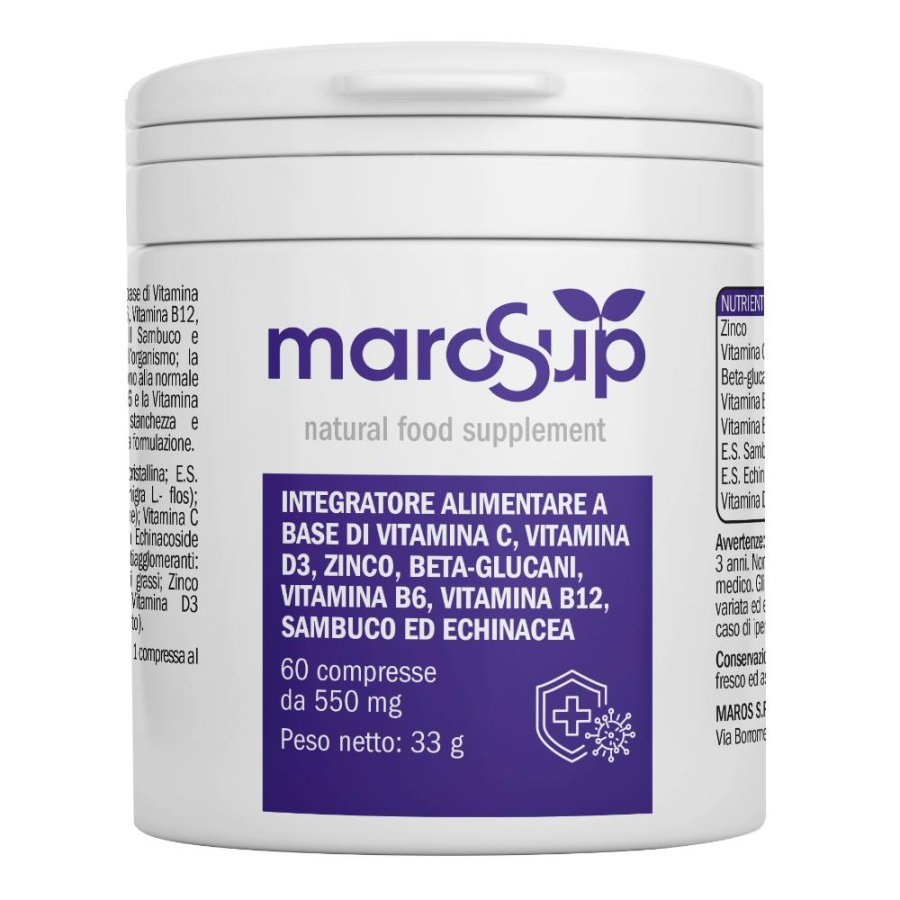 Integratore alimentare a base di vitamina C, vitamina D3, zinco, beta-glucani, vitamina B6, vitamina B12, estratto secco di sambuco ed echinacea.