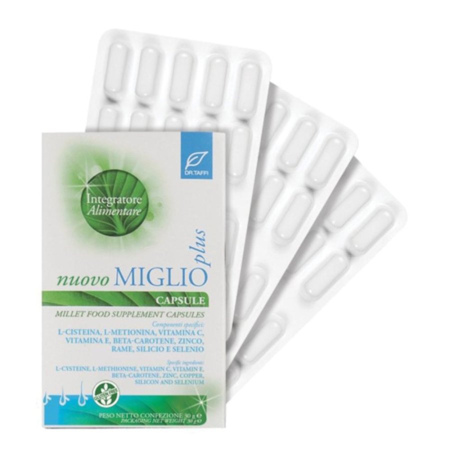 Integratore alimentare a base di miglio, selenio, silicio e vitamine, utili per il nutrimento delle cellule del corpo e della cute come capelli ed unghie.Ingredienti