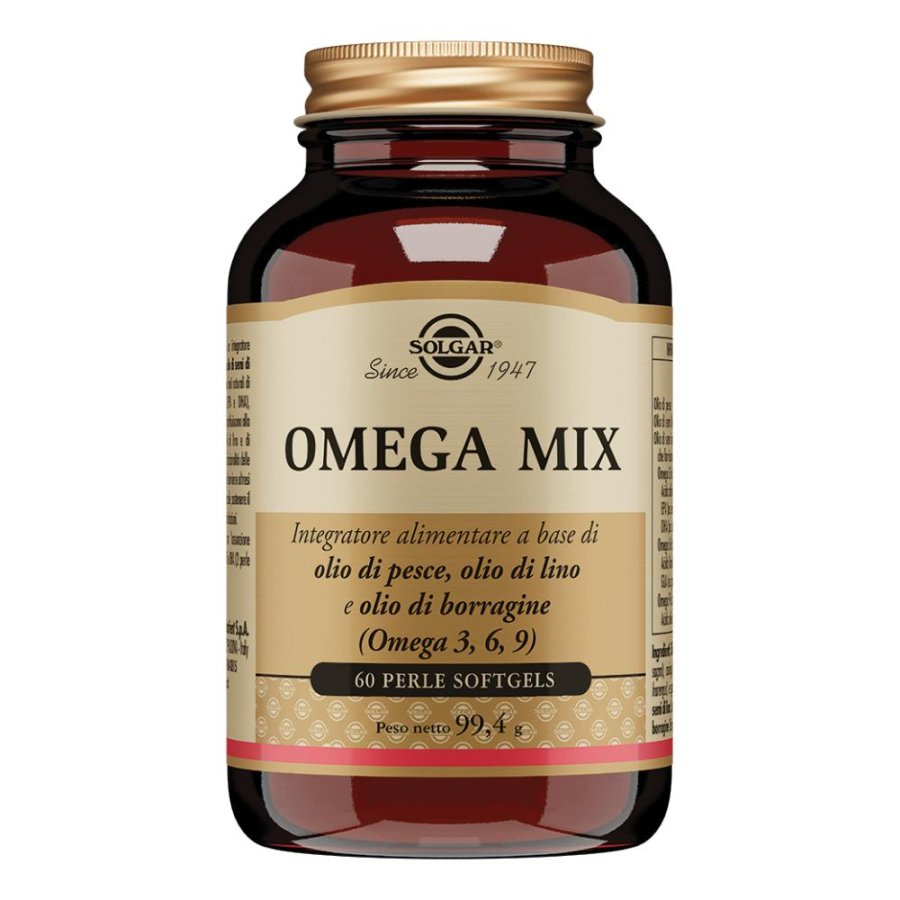 L'integratore Solgar Omega Mix 60 Perle è formulato con olio di pesce, olio di semi di lino e olio di semi di borragine, naturali fonti di acidi grassi insaturi omega-3 (EPA e DHA), omega-6 e omega-9. Questi acidi grassi sono essenziali per la salute cardiovascolare, il benessere delle membrane cellulari e il trofismo di pelle e articolazioni.