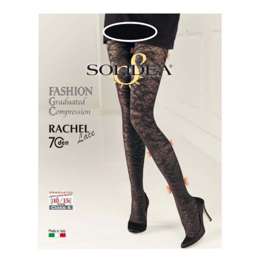 Collant in pizzo a compressione graduata. Il disegno esclusivo esalta sensualità e charme per un effetto ricco e lussuoso, da abbinare al look più sobrio ed ottenere un outfit di grande classe. L’azione preventiva della compressione graduata 10/15 mmHg combatte pesantezza e gonfiori alle gambe e contrasta l’insufficienza venosa senza disturbare l’aspetto raffinato e l’estetica impareggiabile della trama in pizzo. Con funzione igienica Sanitized.Colore: nero.