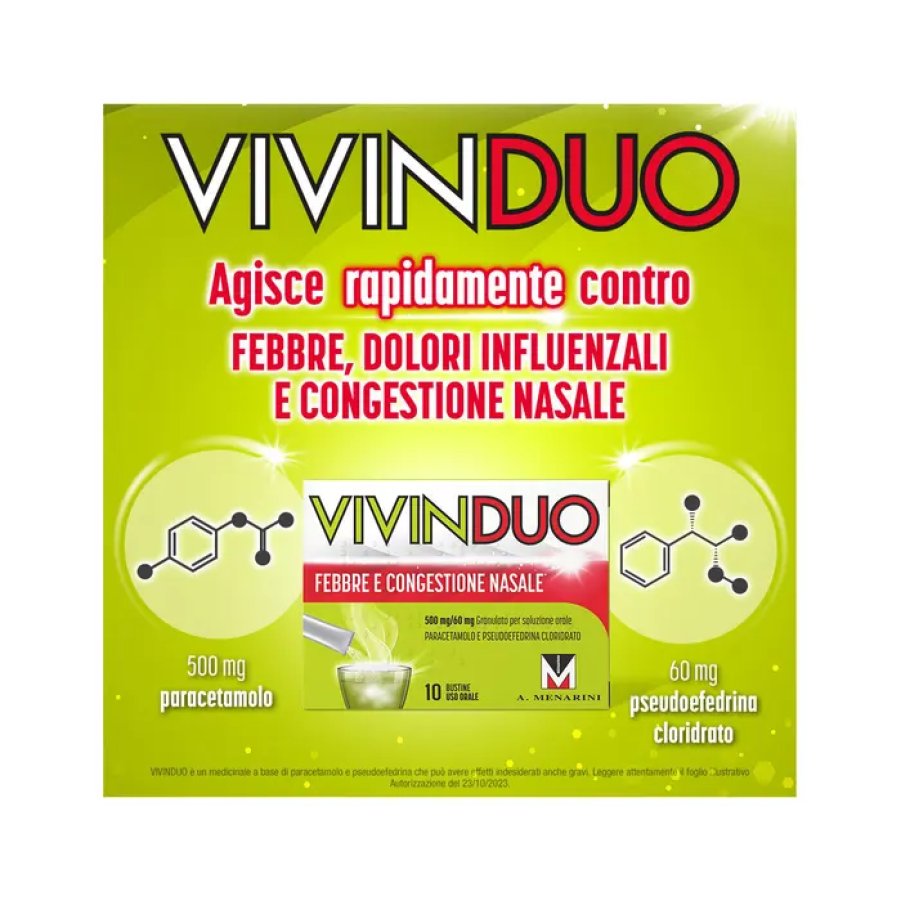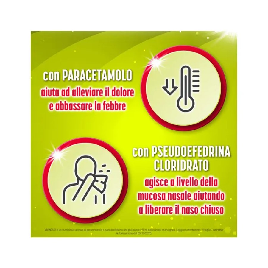 Vivinduo febbre e congestione nasale è un medicinale in bustine contenente paracetamolo 500 mg e pseudoefedrina cloridrato 60 mg, indicato per il trattamento dei sintomi di raffreddore e influenza. Ogni bustina da 1,5 g contiene una formulazione studiata per contrastare febbre, malessere generale e congestione nasale. Questo prodotto è molto utilizzato per il suo effetto combinato analgesico e decongestionante, ideale per alleviare i fastidi tipici delle malattie respiratorie stagionali. Le bustine sono facili da assumere, sciolte in acqua, e offrono una soluzione rapida e pratica per il sollievo dai sintomi influenzali.